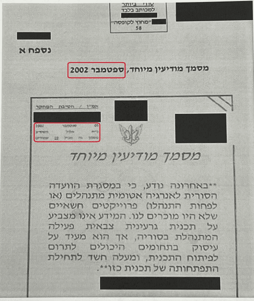 В тайном военном документе стоит дата — сентябрь 2002 года. В нем отмечается, что сирийская комиссия по атомной энергии ведет секретные проекты.