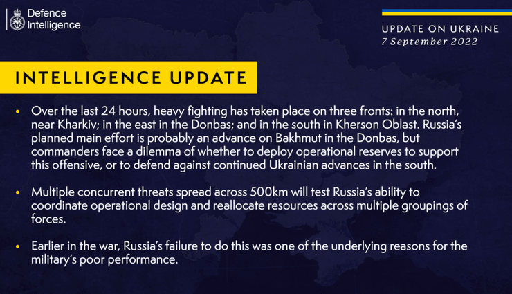 Также в Минобороны Британии отмечают, что многочисленные одновременные угрозы на линии фронта, длинной в 500 км, покажут, сможет ли Россия координировать оперативный план и перераспределять ресурсы между многочисленными группировками войск.