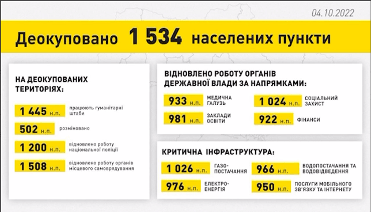 "Уже деоккупировано 1 534 населенных пункта. На территории Донецкой, Луганской, Николаевской, Харьковской и Херсонской областей возобновляется работа органов государственной власти", — заявил он.