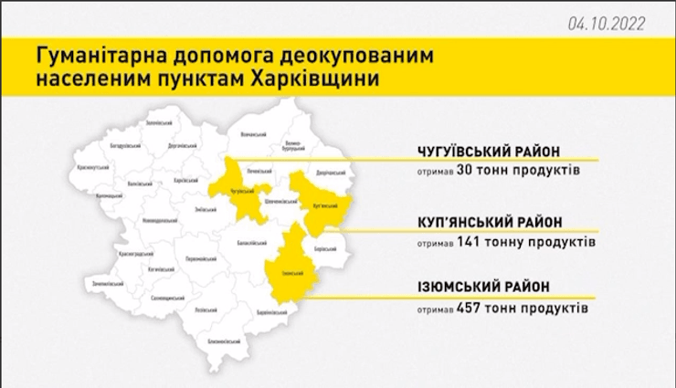 Гуманитарную помощь, по словам Кирилла Тимошенко, доставляют каждый день. Изюмский район получил 457 тонн продуктов, Купянский — 141 тонну, а Чугуевский — 30 тонн.
