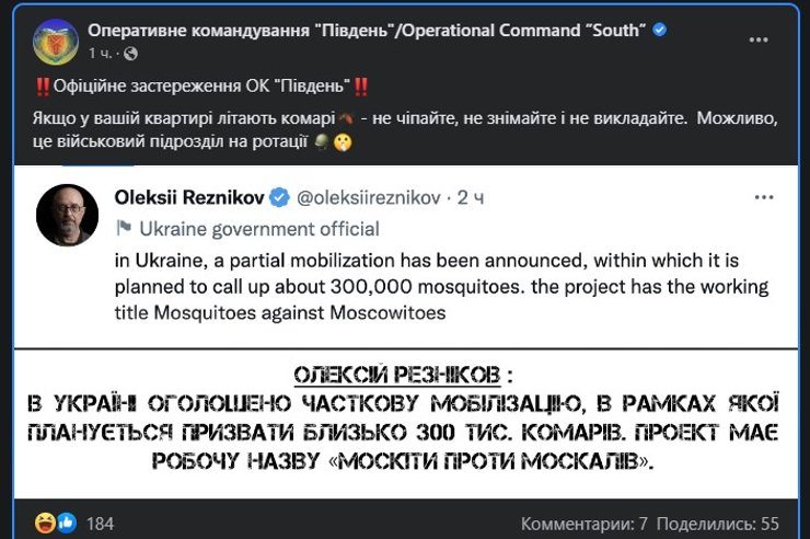 "В Украине объявлена частичная мобилизация, в рамках которой планируется призвать около 300 тыс. комаров. Проект имеет рабочее название "Москиты против москалей", — написал глава Минобороны.
