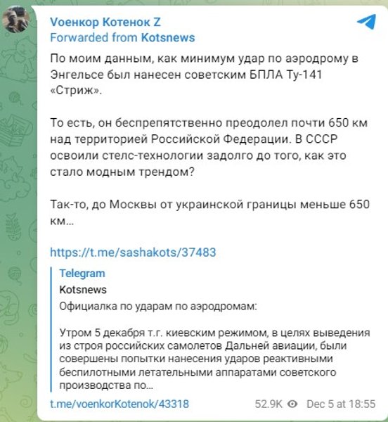 Российские "военкоры", комментируя взрывы на военных аэродромах утверждают, что удар был нанесен советским разведывательным беспилотником Ту-141 "Стриж". В частности Юрий Котенок в своем Telegram написал, что перед тем как атаковать военных объект, беспилотник времен СССР пролетел незамеченным 650 км по территории Российской Федерации.