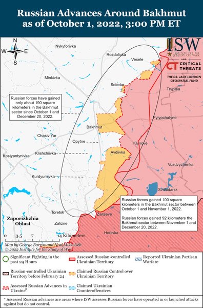 "Российские войска отвоевали в районе Бахмута 100 кв. км с 1 октября по 1 ноября и 92 кв. км в период с 1 ноября по 20 декабря. Скорость наступления за последние 50 дней примерно соответствует темпу наступления россиян в октябре", — подсчитали эксперты.