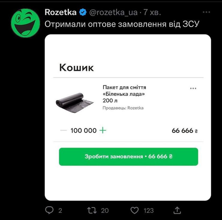 К сетевому юмору присоединились и украинские компании. Так, в аккаунте маркетплейса Rozetka появилась шутка о том, что ВСУ заказали оптом 100 тыс. пакетом для мусора "Беленькая лада" с отсылкой на то, что правительство России обещало выдавать родственникам погибших на войне россиян автомобили.