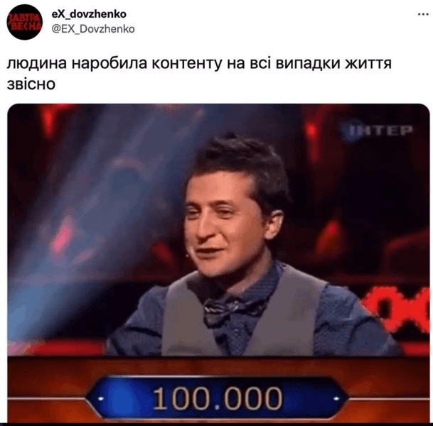 В сети также вспомнили о том, что Владимир Зеленский когда-то вел телешоу "Миллионер — Горячее кресло", а также привязали шутку про 100 тысяч к другим темам и известным персонажам.