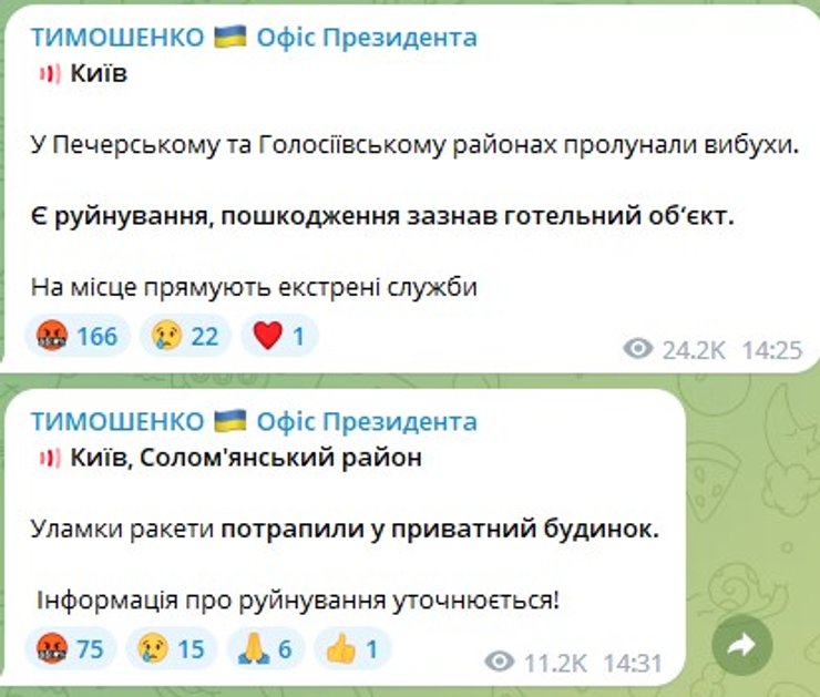 "Один из взрывов прогремел между жилыми домами в Соломенском районе столицы. Также взрывы произошли в Печерском районе и Голосеевском. Есть разрушения. Спасатели и медики следуют на места", — написал Кличко.