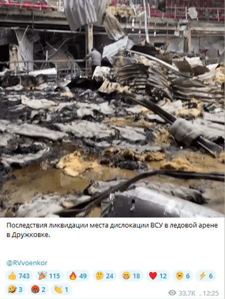 Российские военкоры утверждают, что оккупанты якобы попали в "военный объект ВСУ", который находился в квадрате Дружковки. В ледовой арене, по их данным, был личный состав украинской армии.
