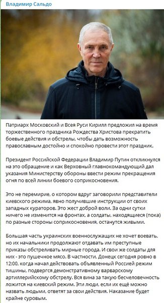 Глава оккупационной администрации Херсонской области Владимир Сальдо ответил на реакцию украинских властей по поводу режима прекращения огня на время праздника Рождества Христова. Коллаборант обвинил ВСУ в артиллерийском обстреле Донецка ровно в 12:00 и пригрозил Киеву "крайне суровыми наказаниями". Свою публикацию Сальдо разместил на Telegram-канале.