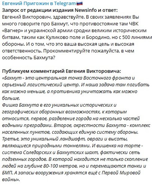 Пригожин добавил, что на глубине до 100 метров в этом городе может размещаться личный состав и военная техника, а также в этих шахтах хранится оружие времен Первой мировой войны.