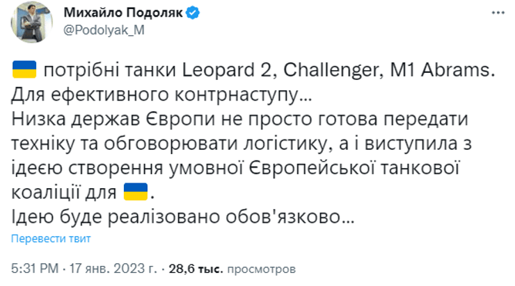 "Ряд государств Европы не просто готовы передать технику и обсуждать логистику, но и выступили с идеей создания условной Европейской танковой коалиции для Украины. Идея будет реализована обязательно", — написал Подоляк.