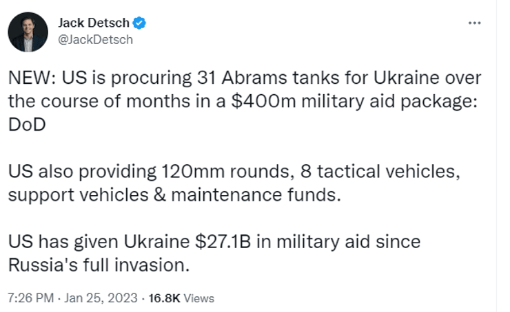 Напомним, о намерениях США передать Украине 31 американский танк M1 Abrams сообщил 25 января корреспондент агентства Bloomberg в Белом доме Джордан Фабиан. По его словам, сумма очередного пакета военной помощи Украине составит 400 миллионов долларов.