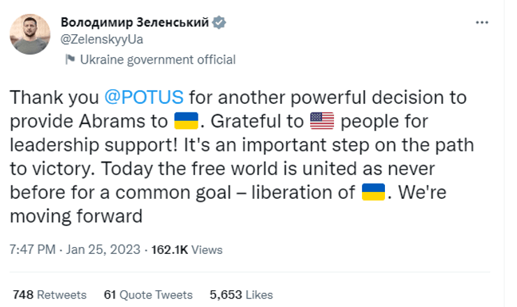 Президент Украины Владимир Зеленский поблагодарил американского коллегу за решение предоставить Украине танки Abrams.