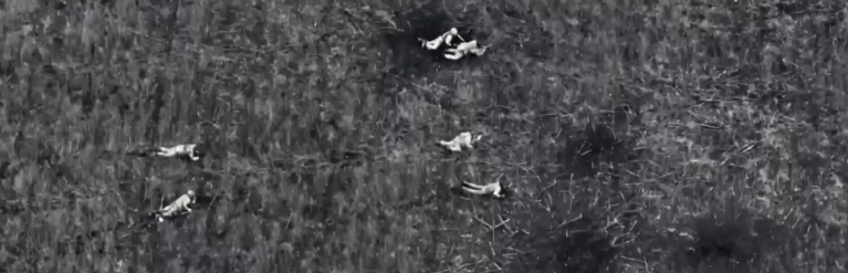 Российских наемников в белой маскировочной одежде хорошо видно на бесснежном поле. Некоторые получили ранения и пытались уползти с обстреливаемого артиллеристами квадрата.