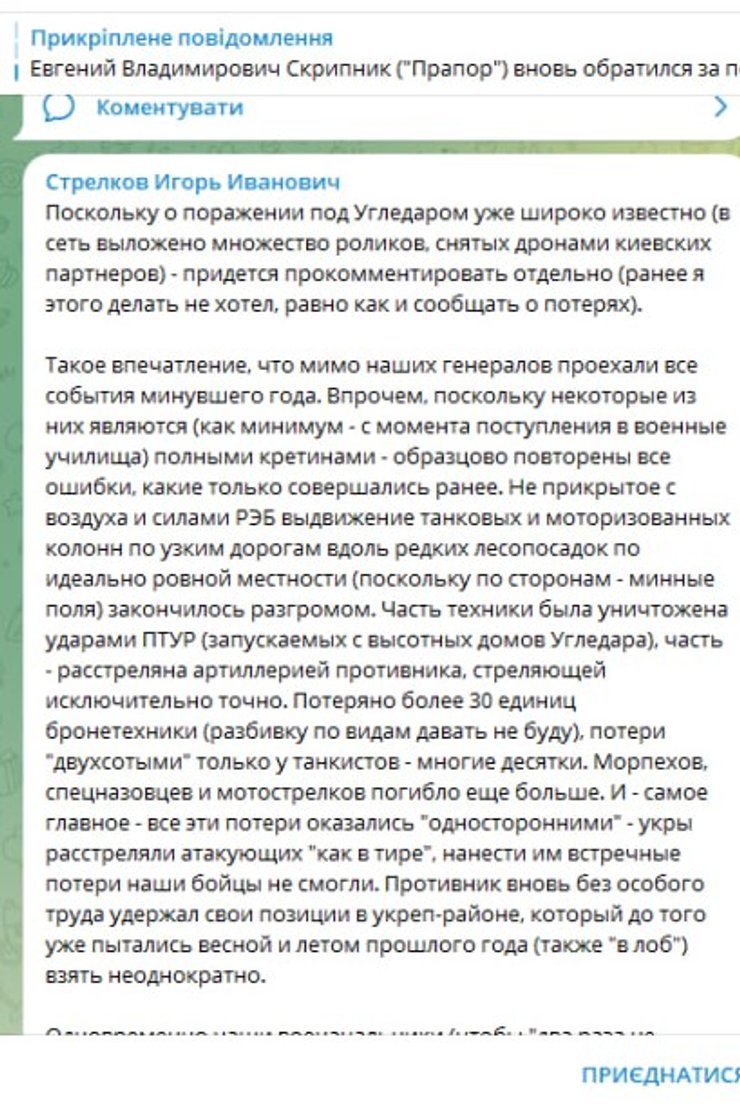 "Потеряно более 30 единиц бронетехники, потери "двухсотыми" только у танкистов — много десятков. Морпехов, спецназовцев и мотострелков погибло еще больше. И — самое главное — все эти потери оказались "односторонними" — укры расстреляли атакующих "как в тире", встречных потерь нанести наши бойцы не смогли. Противник снова без особого труда удержал свои позиции в укрепрайоне, который до этого уже пытались весной и летом прошлого года (также "в лоб") взять неоднократно", — комментирует Гиркин.
