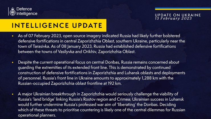 Россия продолжает укреплять оборонительные сооружения на территории Запорожской и Луганской областей, пытаясь противостоять угрозам наступления Вооруженных сил Украины. Об этом сообщает разведка Великобритании в отчете за 13 февраля.