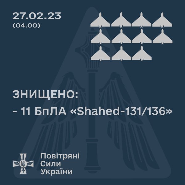В ночь на 27 февраля Россия атаковала Украину дронами-камикадзе. ВСУ удалось сбить большинство из них. Об этом сообщают в Генеральном штабе Вооруженных сил Украины.