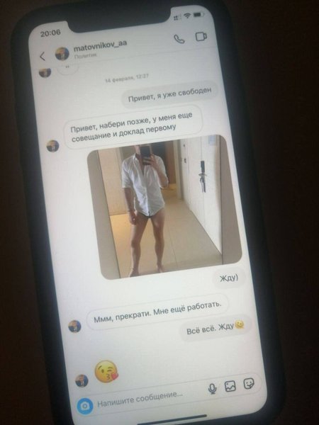Кому именно посылал "клубничное" видео с танцами российский генерал неизвестно. Но вскоре в сети появилась и интимная переписка заместителя главнокомандующего Сухопутными войсками ВС РФ с "дамой сердца". Судя по скриншоту, Матовников общался с неизвестным мужчиной, приславшим топ-генералу откровенное фото.