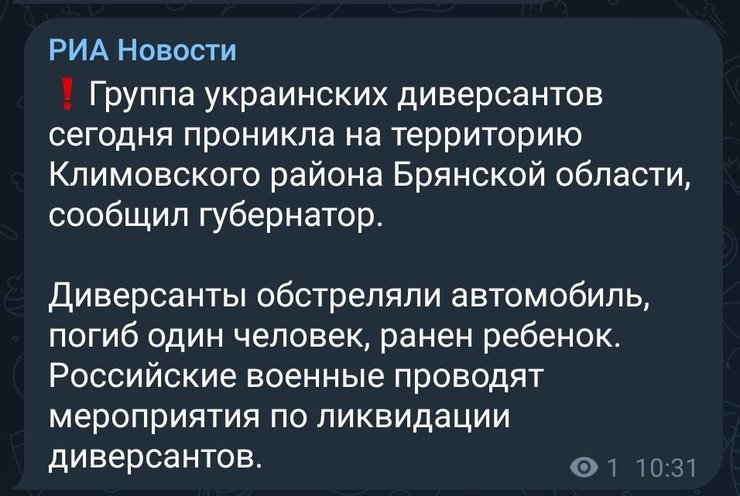 "Сегодня из Украины на территорию Климовского района в село Любечаны проникла ДРГ. Диверсанты произвели обстрел двигавшегося автомобиля. В результате обстрела один житель погиб, ранен десятилетний ребенок. В настоящее время ребенок доставлен в больницу, ему предоставляется вся нужная помощь", — говорится в сообщении.