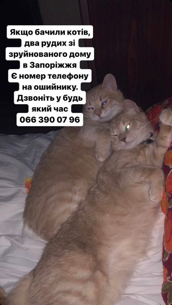 "Если видели котов, два рыжих из разрушенного дома в Запорожье (есть номер телефона на ошейнике), звоните в любое время", — попросила Екатерина.