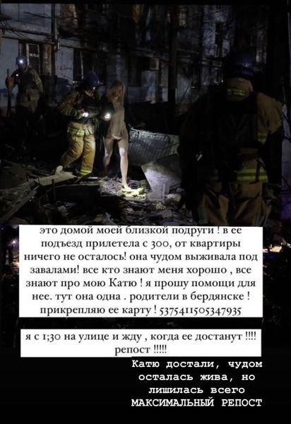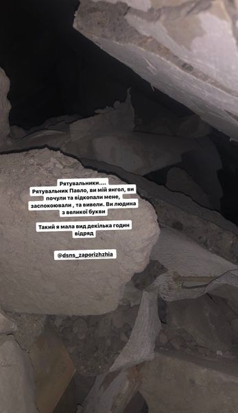 Екатерина из Запорожья провела по меньшей мере 5 часов под завалами многоквартирного дома, в который попала российская ракета. От ее квартиры ничего не осталось, девушка разыскивает своих кошек. Об этом стало известно из соцсетей – ее и подруги.