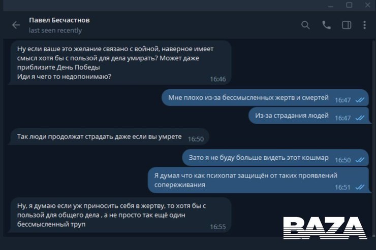 Отмечается, что местный житель Андрей (имя изменено), который на фоне последних потрясений в мире задумался о самоубийстве, обратился к московскому психиатру с 15-летним стажем Павлу Бесчастнову. Тот выслушав пациента, предложил ему поразмыслить над тем, что можно не становиться "бессмысленным трупом", а умереть "с пользой для дела" ради победы.
