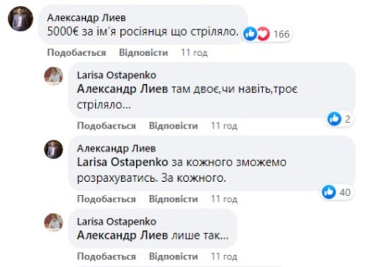 Расстрел безоружного украинского защитника оккупантами шокировал и возмутил общество. Украинцы объявили о денежном вознаграждении тем, кто назовет его убийц. Финансовое предложение граждане начали делать под публикацией правозащитника и участника войны Маси Найема, написавшего пост об установлении личности погибшего. Он предложил за имя павшего воина вознаграждение.