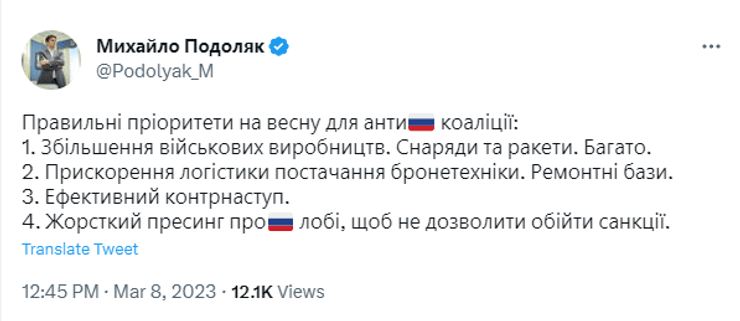 Западная антироссийская коалиция весной этого года должна оказывать давление на Россию и помогать Украине готовиться к дальнейшему контрнаступлению. Об этом написал в Twitter 8 марта советник главы Офиса президента Украины (ОП) Михаил Подоляк.