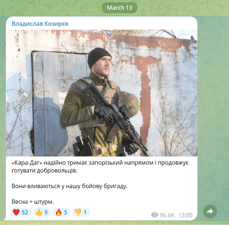 ""Кара-Даг" надежно держит запорожское направление и продолжает готовить добровольцев. Они вливаются в нашу боевую бригаду. Весна = штурм", — написал он.
