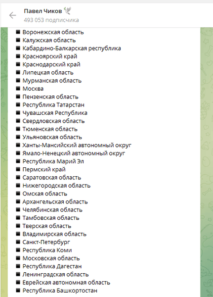 Чиков привел список 35-ти регионов, где рассылают повестки. Среди них — Москва, Петербург, Ленинградская, Московская, Белгородская и Мурманская области, Алтайский, Пермский, Красноярский и Краснодарский края.