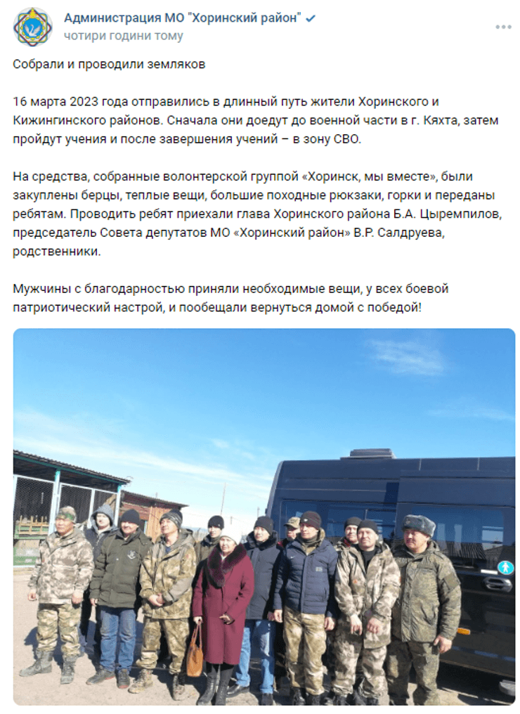 "Собрали и отправили земляков. 16 марта 2023 года отправились в длинный путь вновь мобилизованные жители Хоринского и Кижингинского районов", — заявили в соцсетях администрации.