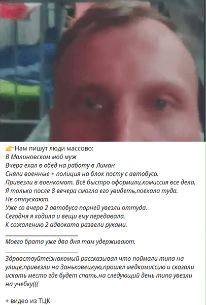 "Мой муж вчера ехал в обед на работу в Лиман. Сняли военные и полиция на блокпосту с автобуса. Привезли в военкомат. Все быстро оформили, комиссия все дела. Я только после 8 вечера смогла его увидеть, поехала туда. Не отпускают. Два автобуса парней увезли оттуда. Сегодня я ходила и вещи ему передавала. Два адвоката развели руками. Моего брата уже два дня там удерживают", — говорится в сообщении.