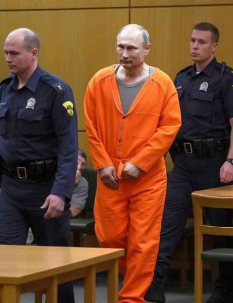 Советник министра внутренних дел Антон Геращенко запостил фото Путина в оранжевой тюремной робе, которого на суд сопровождают охранники.