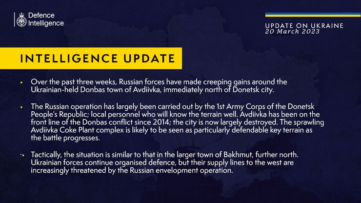 За последние три недели российские войска добились "ползучих успехов" в направлении Авдеевки Донецкой области. В нынешний момент город в значительной степени разрушен. Об этом сообщает разведка Великобритании в сводке за 20 марта.