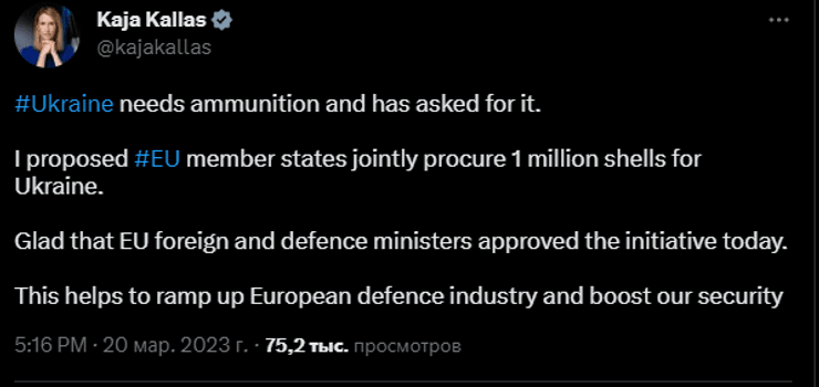 Согласованный министрами ЕС план совместной закупки боеприпасов предусматривает поставку Украине 1 миллиона снарядов. Об этом сегодня, 20 марта, сообщила в Twitter премьер-министр Эстонии Кая Каллас.