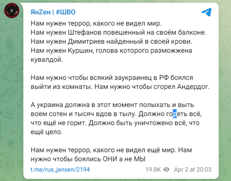 Российский активист и блогер Илья Янсен призвал к "террору, какого не видел мир".