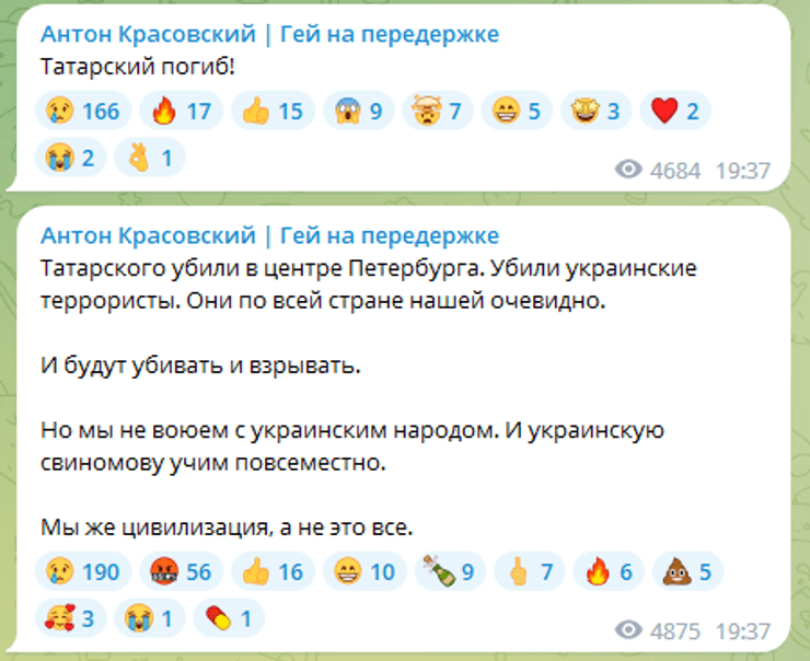 Призывавший убивать украинских детей Антон Красовский считает, что Татарского убили якобы "украинские террористы".