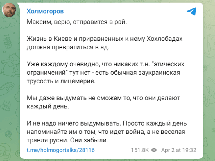 "Уже каждому очевидно, что никаких "этических ограничений" тут нет… Мы даже выдумать не сможем то, что они делают каждый день. И не надо ничего выдумывать. Просто каждый день напоминайте им о том, что идет война, а не веселая травля русни. Они забыли", — сообщил Холмогоров.