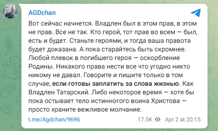"Кто герой, тот прав во всем — был, есть и будет. Станьте героями, и тогда ваша правота будет доказана. А пока старайтесь быть скромнее. Любой плевок в погибшего героя — оскорбление Родины. Никакого права нести все что угодно никто никому не давал. Говорите и пишите только в том случае, если готовы заплатить за слова жизнью. Как Владлен Татарский. Либо некоторое время — хотя бы пока остывает тело истинного воина Христова — просто храните вежливое молчание", — отметил он.