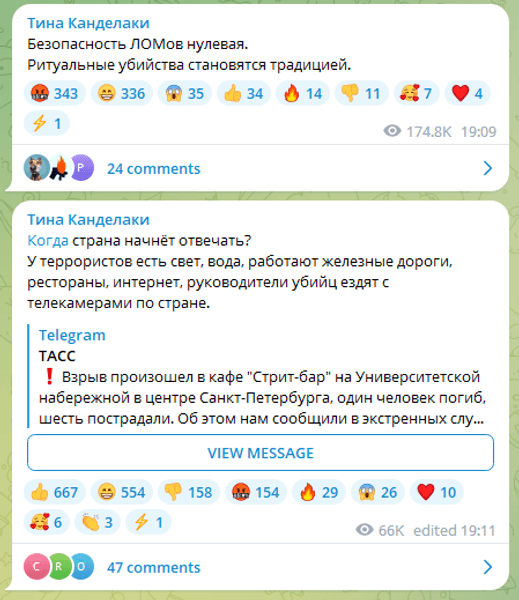 Напомним, что 2 апреля в кафе "Street food bar" в Санкт-Петербурге раздался взрыв. Погиб российский военкор Татарский, который организовал в заведении творческий вечер.