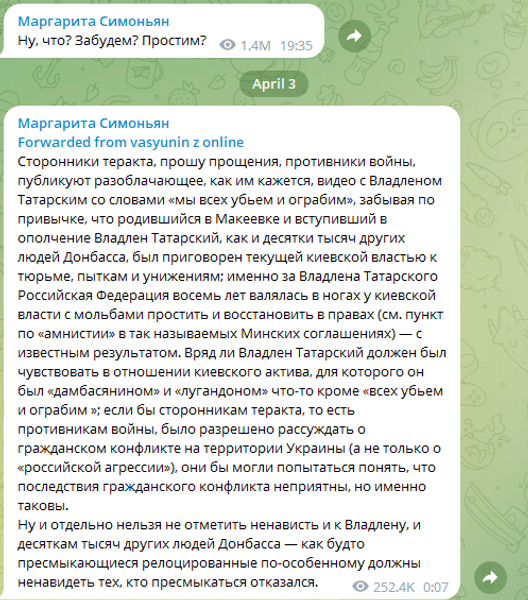 "Родившийся в Макеевке и вступивший в ополчение Владлен Татарский, как и десятки тысяч других людей Донбасса, был приговорен киевской властью к тюрьме, пыткам и унижениям. Именно за Владлена Татарского РФ 8 лет валялась в ногах у киевской власти с мольбами простить и восстановить в правах… Нельзя не отметить ненависть и к Владлену, и к десяткам тысяч других людей Донбасса — как будто пресмыкающиеся релоцированные по-особенному должны ненавидеть тех, кто пресмыкаться отказался", — говорится в публикации.