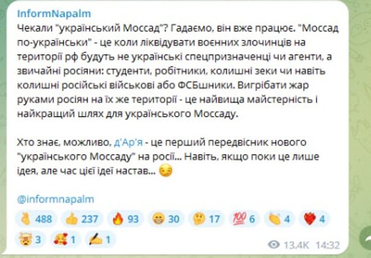 "Ждали "украинский Моссад"? Думаем, он уже работает. "Моссад по-украински" — это когда ликвидировать военных преступников на территории РФ будут не украинские спецназовцы или агенты, а обычные россияне: студенты, рабочие, бывшие зеки или даже бывшие российские военные или ФСБшники. Выгребать жар руками россиян на их же территории — это высшее мастерство и лучший путь для украинского Моссада", — говорится в сообщении.
