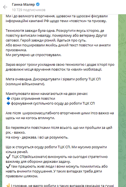 "Сейчас противник немного усложнил свою технологию и добавляет истории об удивительных местах вручения повесток и "волнах" мобилизации. Манипулировать он пытается на двух вещах: страх получения повестки, формирование общественного осуждения к работе ТЦК СП (территориальных центров комплектования и соцподдержки — ред.)", — добавила Маляр.