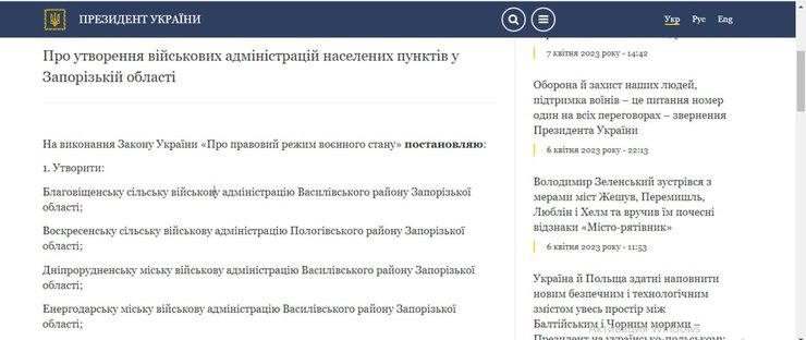 Также президент поручил Генштабу ВСУ и Запорожской ОВА осуществить соответствующие меры по созданию новых военных администраций.