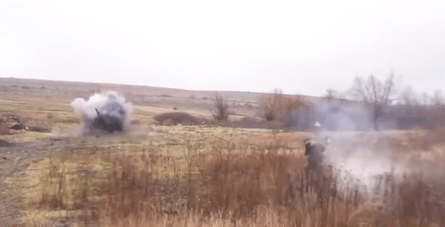Военкор тестировал на камеру возможности поражения танка гранатометом. Сначала он говорит, что произойдет, если выстрелить из него по принципу ведения огня из российских аналогов — РШГ-2 и РПГ-26.