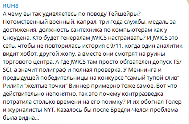"А чему вы так удивляетесь по поводу Тейшейры? Потомственный военный, капрал, три года службы, медаль за достижения, должность сантехника по компьютерам как у Сноудена. Кто будет генералам JWICS настраивать? И JWICS это сеть, чтобы не повторилась история с 9/11, когда один аналитик видит хобот, другой ж*пу, а вместе они смотрят на руины торгового центра", — говорится в заявлении представителя Киберальянса.