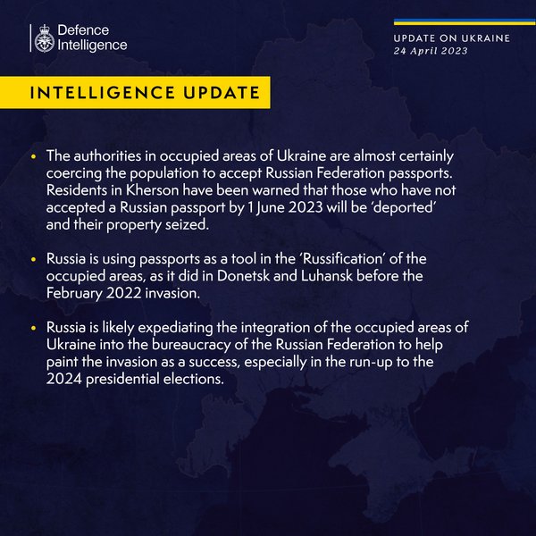 Российские оккупационные власти на временно занятых территориях Украины заставляют население получать паспорта РФ. Об этом говорится в разведсводке Министерства обороны Великобритании на 24 апреля.