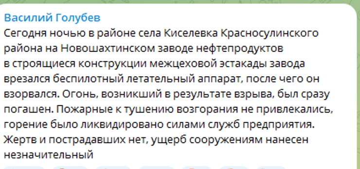 "Сегодня ночью в районе села Киселевка Красносулинского района на Новошахтинском заводе нефтепродуктов в строящиеся конструкции межцеховой эстакады завода врезался беспилотный летательный аппарат, после чего он взорвался. Огонь, возникший в результате взрыва, был сразу погашен", – написал Голубев в телеграм-канале.