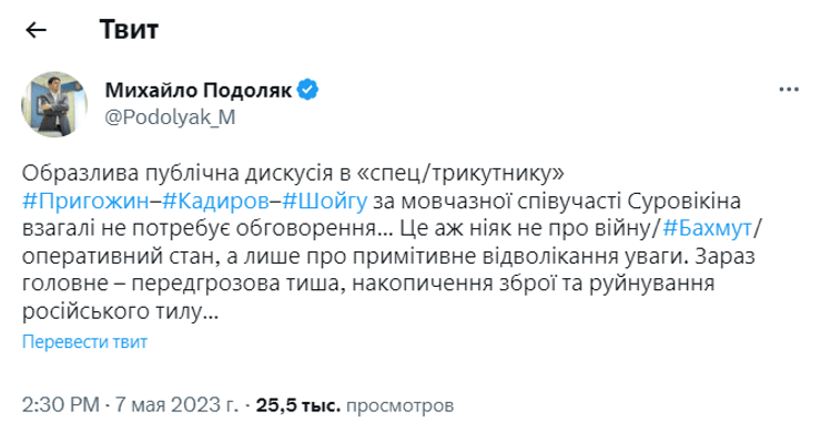 Глава российской ЧВК "Вагнер" Евгений Пригожин поссорился с Министерством обороны России из-за боеприпасов исключительно ради отвлечения внимания. Об этом написал в Twitter 7 мая советник главы Офиса президента (ОП) Михаил Подоляк.