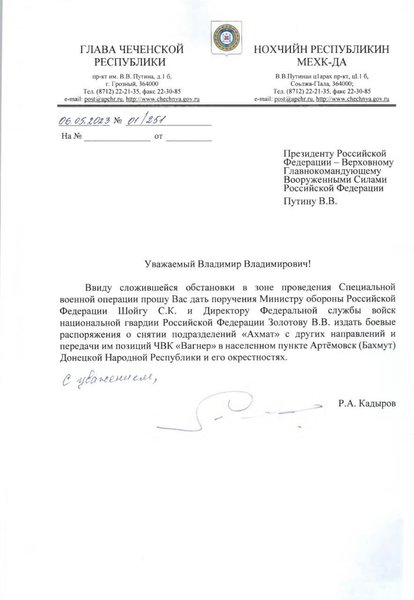 Так, 6 мая Кадыров опубликовал письмо, в котором просил президента России Владимира Путина приказать министру обороны России Сергею Шойгу и директору Росгвардии Виктору Золотову санкционировать переброску чеченских подразделений "Ахмат" с "других направлений" для занятия позиций ЧВК "Вагнер" на бахмутском направлении.