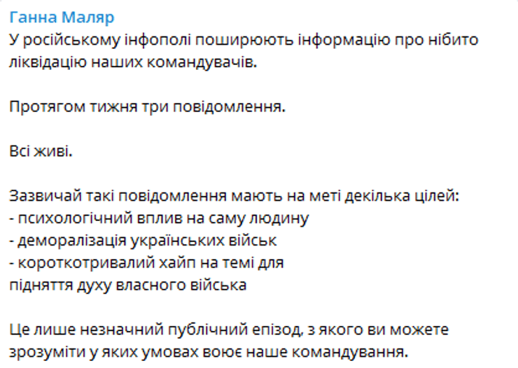 В российском инфополе распространяют информацию о якобы ликвидации украинских командующих на фронте, но это не соответствует действительности. Об этом заявила замминистра обороны Украины Анна Маляр сегодня, 10 мая.